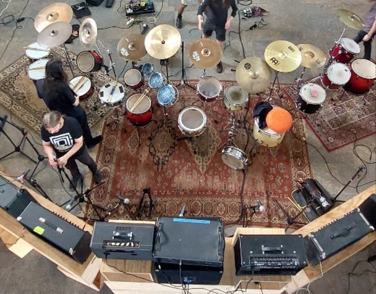 drums, guitars, electronics and video installation.